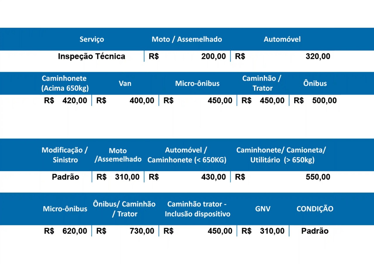 O valor é referenciado com o escopo de inspeção, ou seja, tipo de inspeção, podendo variar de acordo com a espécie e tipo do veículo, devendo ser consultado na recepção da Mega, de posse do CRV (Certificado de Registro de Veículo) ou CRLV (Certificado de Registro e Licenciamento de Veículo) do veículo.